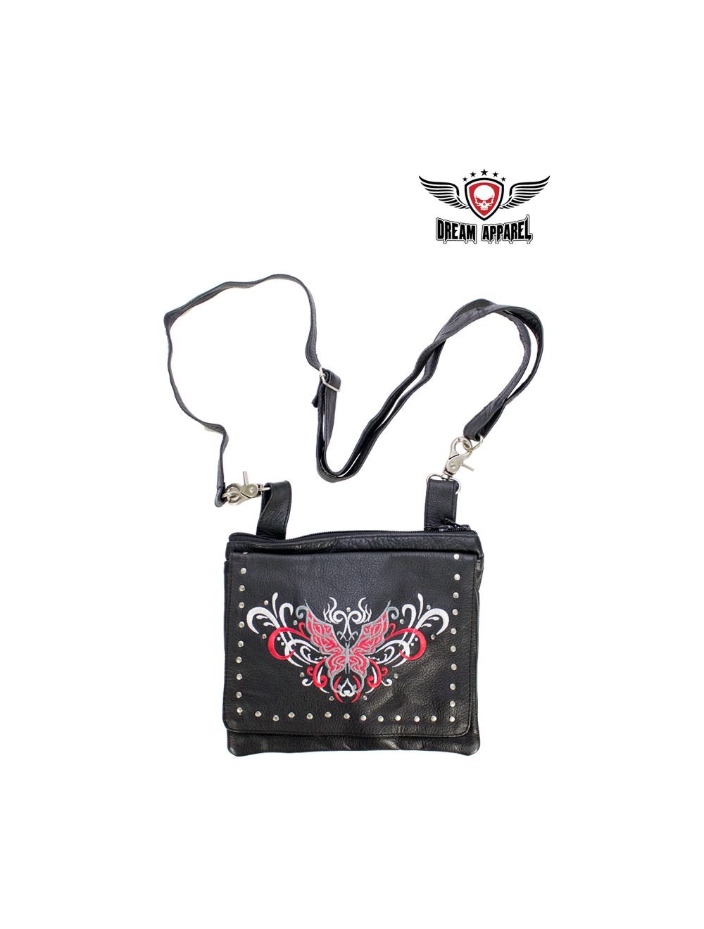 Our studded 8.5" x 7" all naked cowhide leather belt bag with a red and silver butterfly in a white graphic bordered by shiny chrome studs on the front flap pocket is the perfect choice for ladies on the go. Two magnets open to reveal a roomy textile-lined compartment large enough for an iPhone 6 while the two zippered main compartments let you carry loads more. On the back left side, there is a zIppered gun pocket. You can attach it easily to your belt loops with two large chrome lobster clasps or wear it over your shoulder with the adjustable strap that comes included. Show off your class, order yours today.