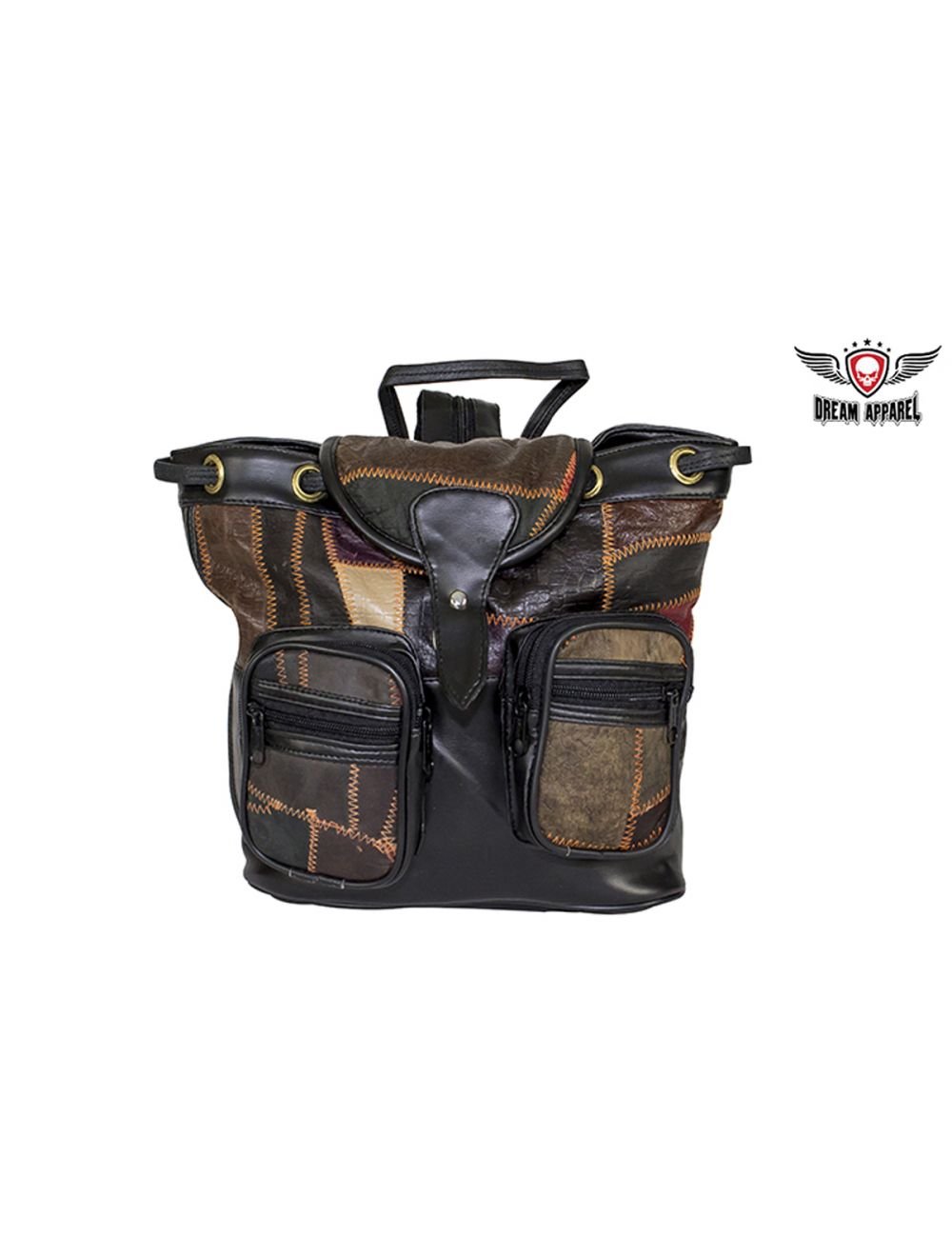 If you're looking for a stylish shoulder bag you can wear riding or dining out, our terrific leather bag is exactly what you're looking for.  With two zippered pockets outside with an additional two zippered pockets on each of them, a really large zippered pocket on the side that runs the whole width of the bag, and one roomy zippered pocket on the black textile lining inside, you can bring everything you need.  Designed in a stunning earth-tone patchwork leather design, additional features include a strong leather shoulder strap that can be used as a single strap or unzipped and doubled to be worn on both shoulders with a leather loop on top to make hanging easy.  Tighten it up by the leather cord and close it with the duck tongue clasp and you can be sure you're ready for anything.