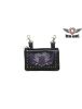 Dream Apparel's 8.5" x 5.5" naked cowhide leather purple flying skull belt bag with grey accents and polished chrome studs on the front flap pocket is perfect for quick runs to the store or long runs to that favorite rendezvous. The dual magnetic flap opens to reveal a roomy textile lined compartment large enough for an iPhone 6 while the two zippered compartments let you carry loads more. You can attach it easily to your belt loops with two large chrome lobster clasps or wear it over your shoulder with the adjustable strap that comes included. Order yours today.