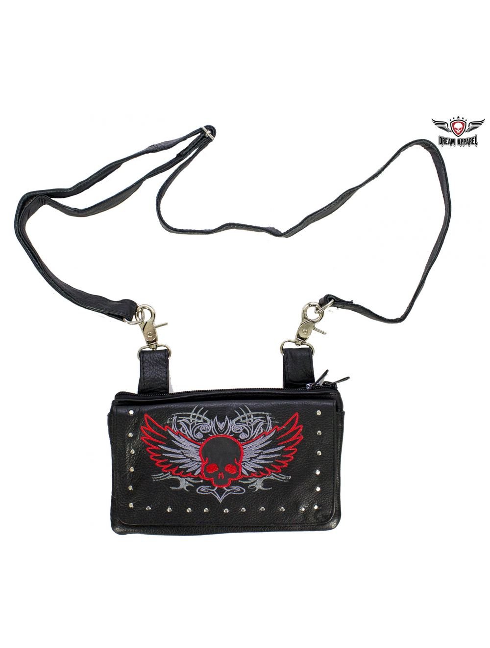 Dream Apparel's 8.5" x 5.5" naked cowhide leather red flying skull belt bag with grey accents and chrome studs on the front flap pocket is the perfect belt bag for a long bike run or a night on the town. The dual magnetic flap makes a great compartment to carry any large cell phone easily while the two zippered, fabric-lined compartments let you carry everything else. You can attach it easily to your belt loops with two large chrome lobster clasps or wear it over your shoulder with the adjustable strap that comes included. This delightful belt bag is the perfect complement to your riding gear so place your order today.